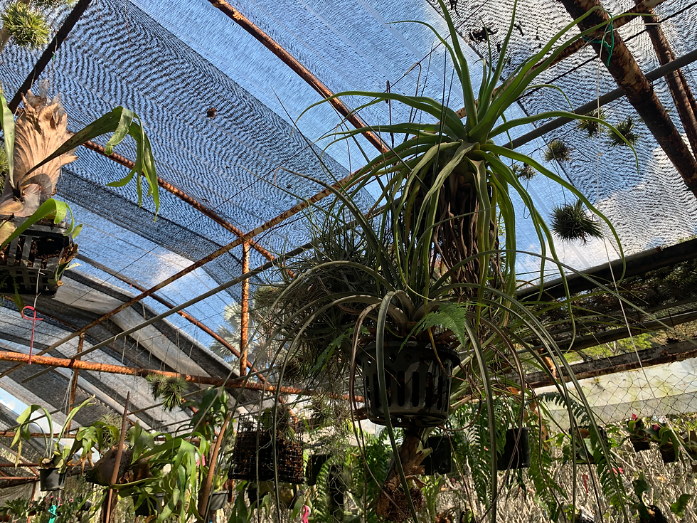 These are everywhere in this nursery with new hybrids right through to mature staghorns, proudly displaying all their fronds, attached to the trunk of majestic raintrees or hung from their branches above.